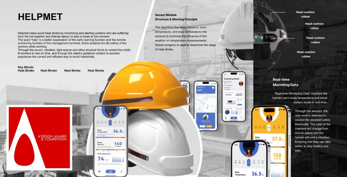 得奖作品Helpmet是一款旨在高温环境下保护建筑工人健康的智能头盔,它集成了传感器监测模块和物理信息通知模块智能监测用户的身体状况,实时地将数据传输到app,联动工人、工友和工头共同关注热相关状况的疾病风险,提供及时的预警和建议,以确保工人的安全和健康。
