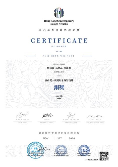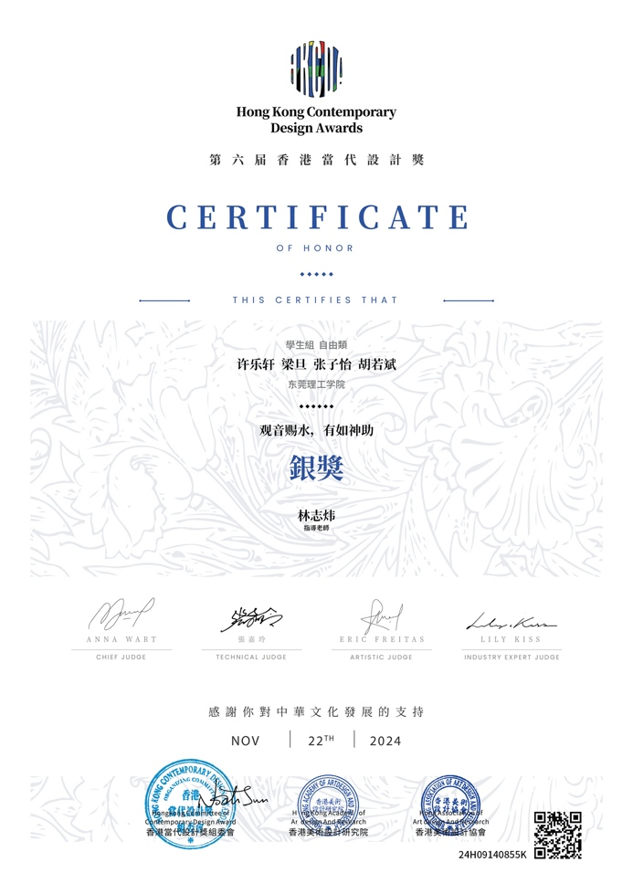 近日,2024第六届香港当代设计奖公布获奖结果。莞工公司员工许乐轩、梁旦、张子怡、胡若斌作品《观音赐水,有如神助》获得银奖;胡贝贝、陈佳淳、周凯欣作品《黎城布老虎视觉形象设计》获得铜奖;何澍森、侯肇杨作品《江苏檀香扇视觉形象设计》获得铜奖;姚茵瞳、高晶晶、廖雨珊作品《无锡惠山泥人视觉形象设计》获得铜奖,指导老师林志炜则获得优秀指导教师奖。