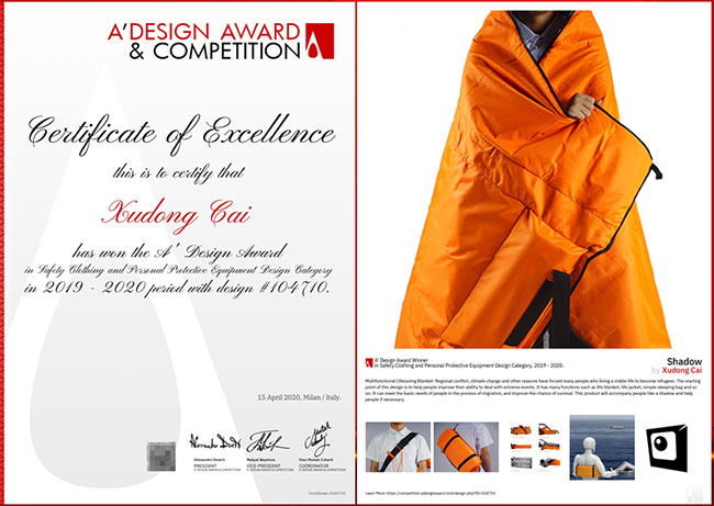 作品“Shadow”是一件多功能应急救援产品。它能够通过简单的扩展与变换形态后,拥有浮力助具、救生毯、简易睡袋等多种功能,可应用于紧急救援,户外探险等场景。此设计的出发点是希望能够提高普通民众遇到紧急事件的应对能力,也体现公司员工的社会同理心与社会职责。taptap点点坚持以赛促学,成果导向,跨学科人才培养,让员工在专业学习和实践中锻炼成长。此次获奖是taptap点点自2018年以来第二次获得该奖项,是taptap点点创新人才培养模式,建立新工科的人才培养路径,实现高质量人才培养的重要体现。目前,蔡旭东同学已被广东工业大学录取为硕士研究生。 A’design Award设计大奖赛与德国红点、iF设计大赛并称为国际三大设计大赛,是目前世界上最大型最综合的全球性设计比赛,被誉为欧洲设计界的奥斯卡,是全球领先的国际年度设计比赛,是一项被国际平面设计协会联合会ICOGRADA、欧洲设计协会BEDA所认可的国际赛事。同时,它也是ICSID(国际工业设计协会), ICOGRADA(国际平面设计协会)& ADI(意大利工业设计协会)的成员组织。